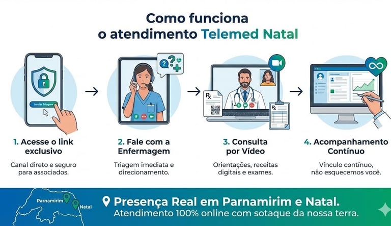 Resolva até 80% dos casos de saúde diretamente pelo celular, evitando esperas exaustivas em pronto-socorros de Natal e Parnamirim.